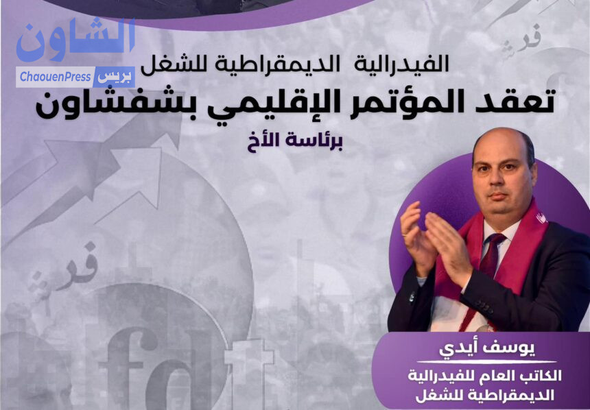 Peut être une image de ‎1 personne et ‎texte qui dit ’‎الديمقراد الفيدرالية الديمقراطية للشغل تعقد المؤتمر الإقليمي بشفشاون برئاسة الأخ يوسف أيدي الكاتب العام للفيدرالية الديمقراطية للشغل فر تحت شعار fat نضال مستمر وتنظيم قوي لكسب رهان المستقبل " و ذلك يوم الأحد 16 فبراير 2025 على الساعة الحادية عشرةو النصف صباحا بمجمع محمد السادس للثقافة و الفنون و الرباضة بشفشاون‎’‎‎
