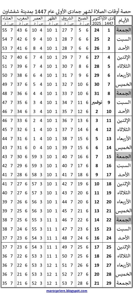 حصة أوقات الصلاة لشهر جمادى الأولى بشفشاون