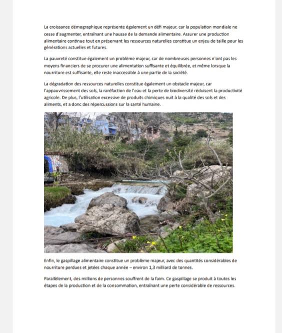 ولم يغفل التلاميذ التطرق إلى عوامل أخرى مؤثرة، من بينها الفقر، وتدهور الموارد الطبيعية، كندرة المياه واستنزاف التربة وفقدان التنوع البيولوجي، فضلاً عن التأثيرات السلبية للاستعمال المفرط للمواد الكيميائية على جودة الغذاء وصحة الإنسان. كما تم تسليط الضوء على ظاهرة التبذير الغذائي، التي تشكل مفارقة عالمية بين وفرة الإنتاج وحرمان فئات واسعة من الغذاء.